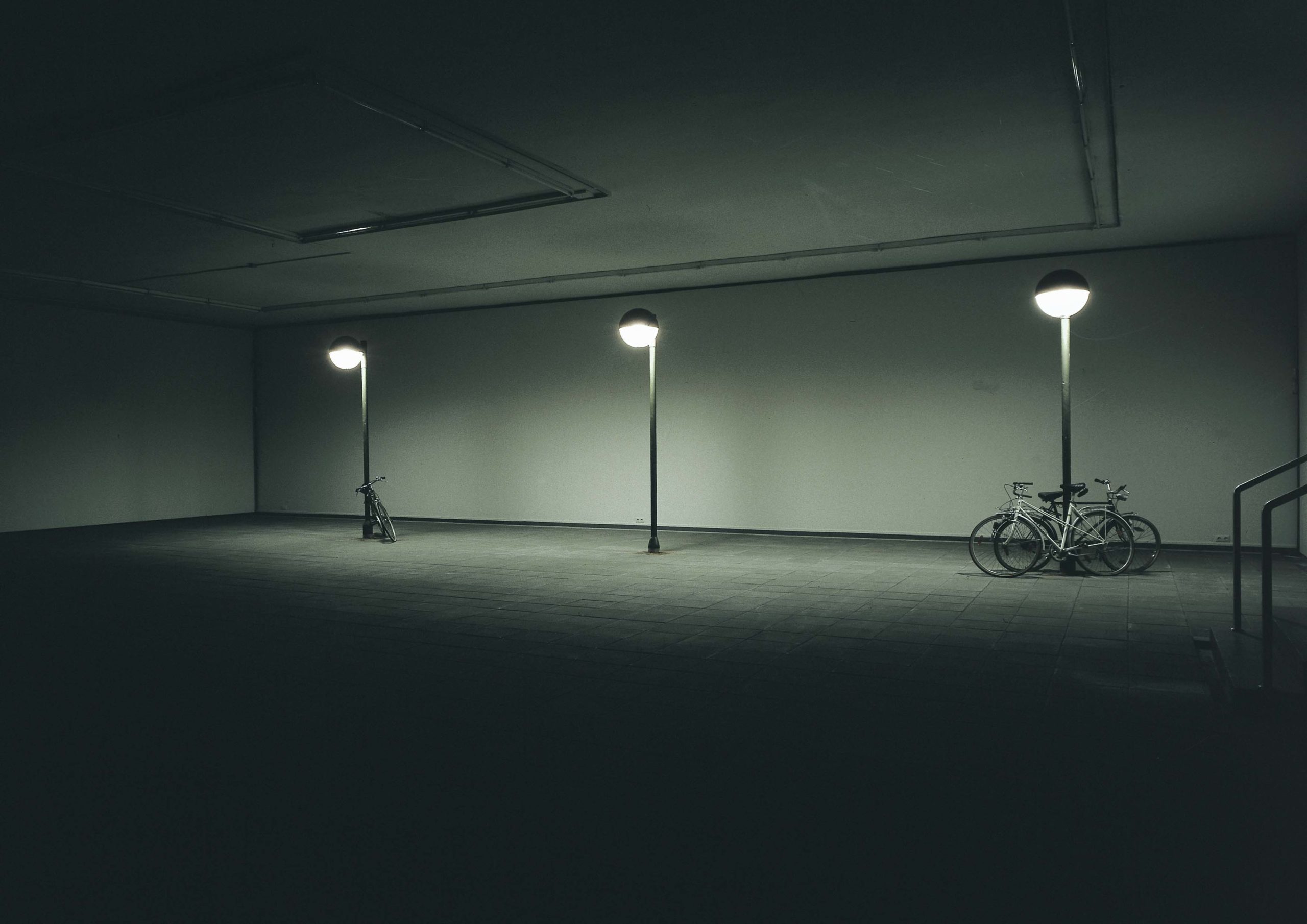 STADTMITTE, Pflasterplatten, Straßenlaternen, Fahrräder, Kunsthalle Recklinghausen, 2002 Foto: Ferdinand Ullrich