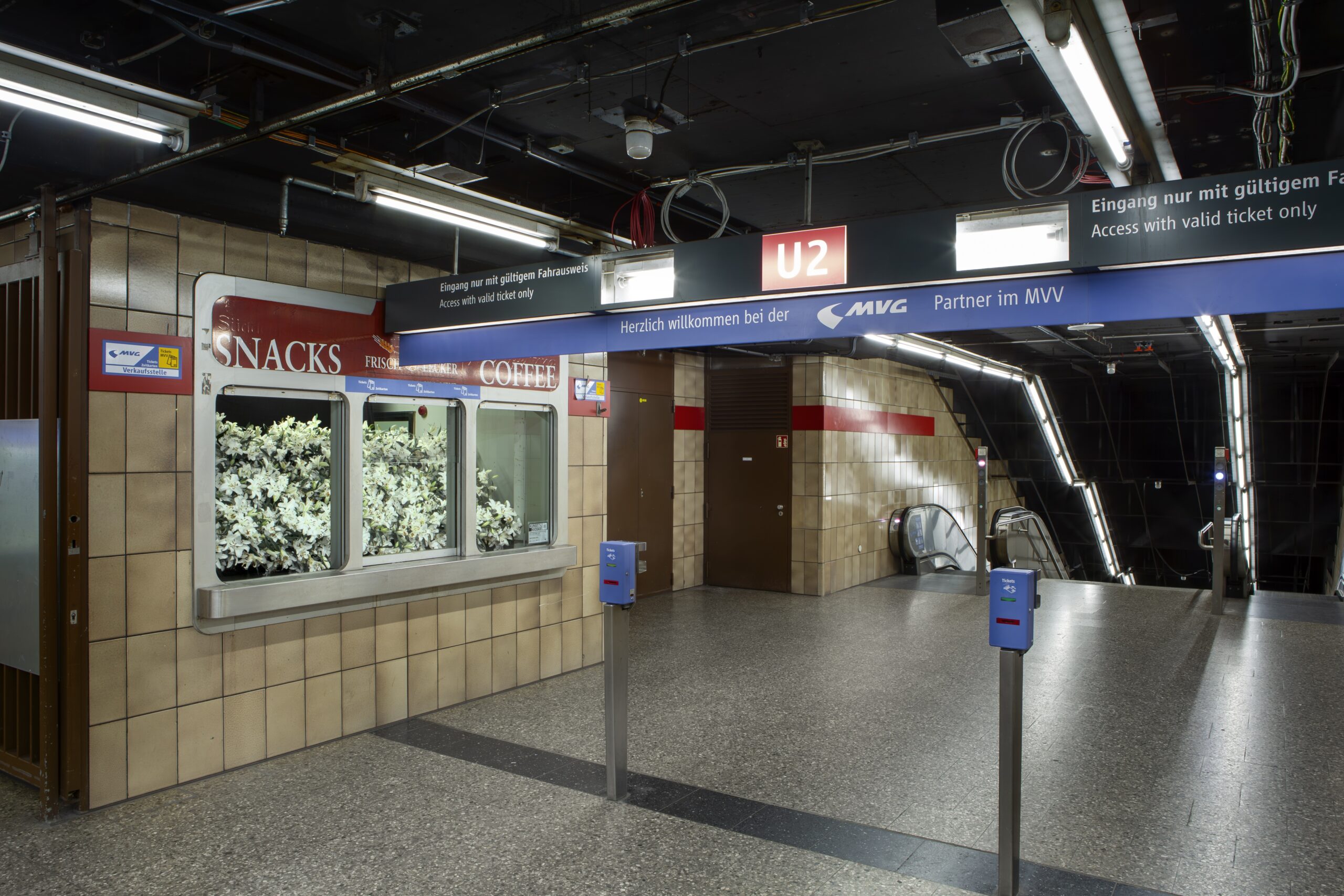 LILIEN, Blumen, Kübel, Treppenkonstruktion, U-Bahnhof Josephsplatz München, 2023 Foto: Hermann Reichenwallner