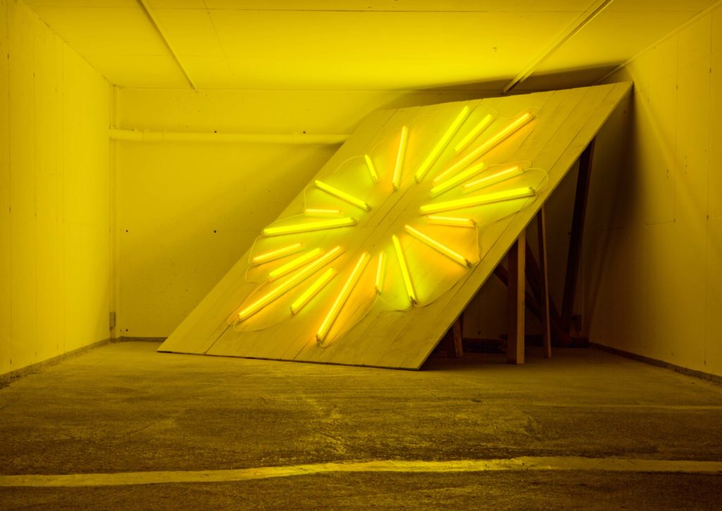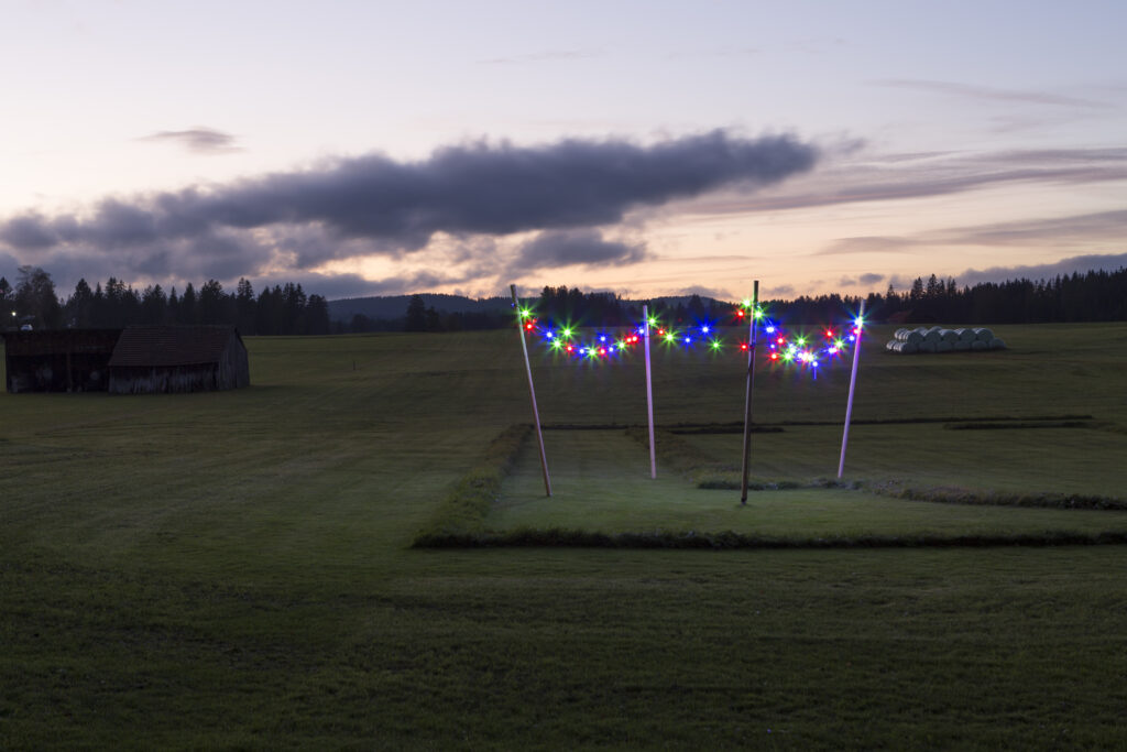 Verpackerei Görisried LICHTHOF, Holz, Farbe, Licht, Verpackerei Görisried, 2017 Foto: Hermann Reichenwallner GLORIOLE, farbige Neonröhren auf Holz, Verpackerei Görisried, 2017 Foto: Hermann Reichenwallner