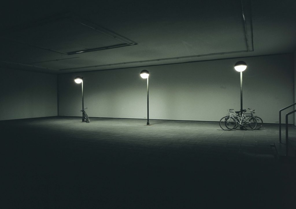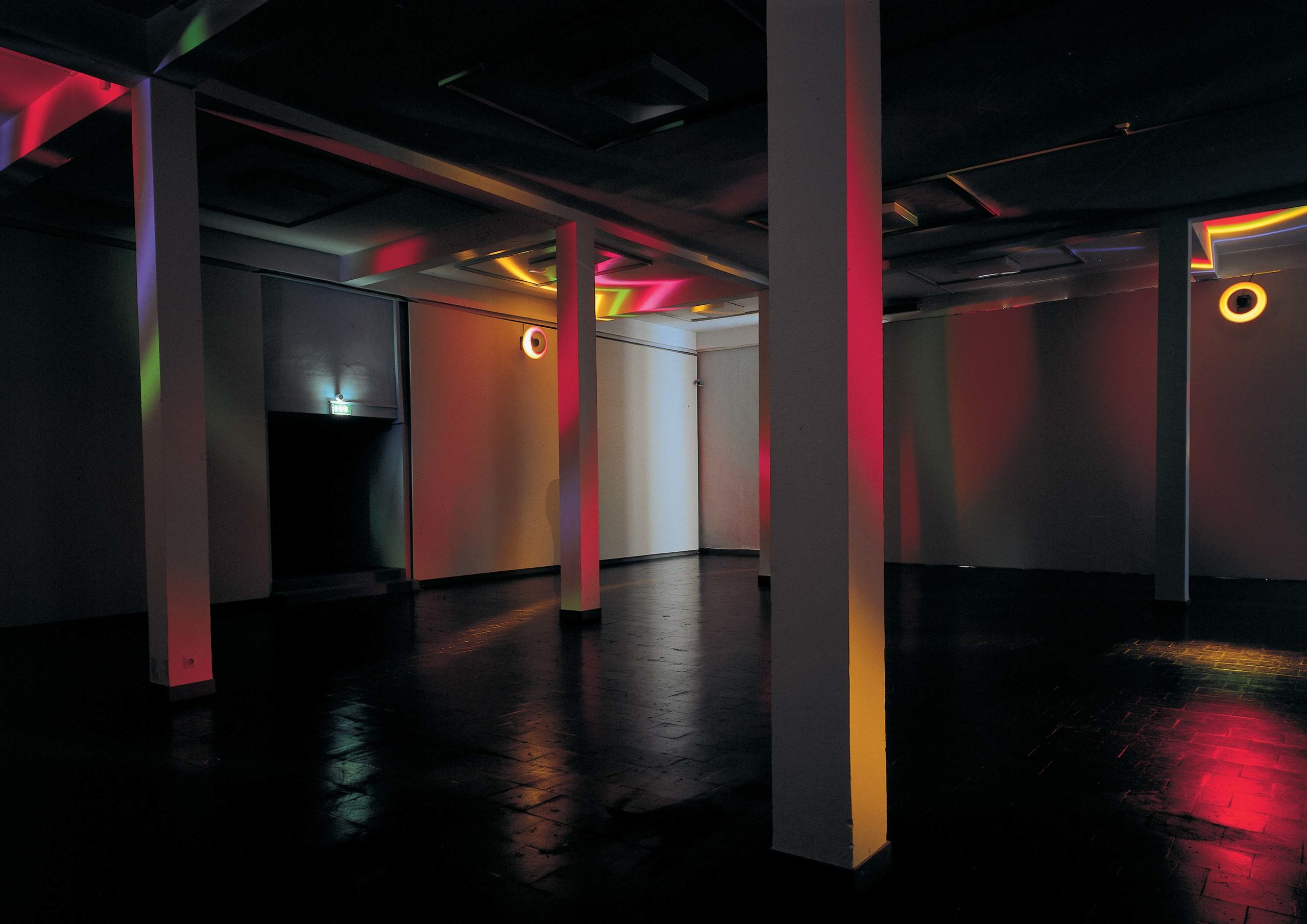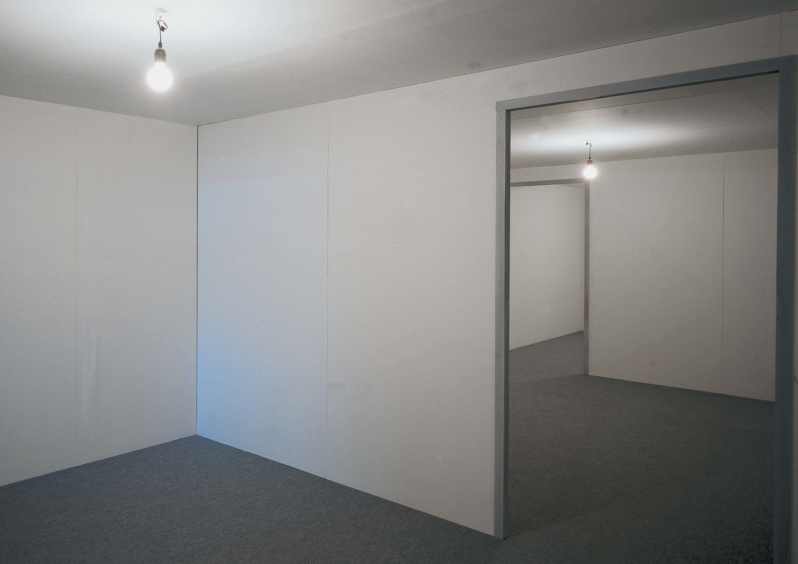 Kunsthalle Recklinghausen STADTMITTE, Pflasterplatten, Straßenlaternen, Fahrräder, Kunsthalle Recklinghausen, 2002 Foto: Ferdinand UllrichTANZPALAST, Lichtorgeln, Kunsthalle Recklinghausen, 2002 Foto: Ferdinand Ullrich300 QM NUTZFLÄCHE, Leichtbauplatten, Teppichboden, Licht, Kunsthalle Recklinghausen, 2002 Foto: Ferdinand Ullrich