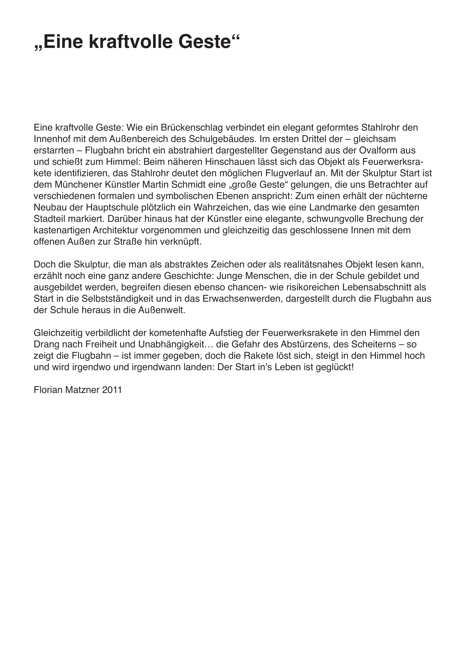 Eine kraftvolle Geste: Wie ein Brückenschlag verbindet ein elegant geformtes Stahlrohr den Innenhof mit dem Außenbereich des Schulgebäudes. Im ersten Drittel der – gleichsam erstarrten – Flugbahn bricht ein abstrahiert dargestellter Gegenstand aus der Ovalform aus ..